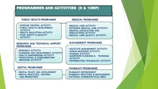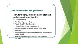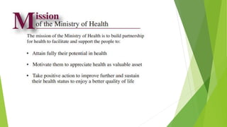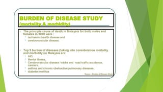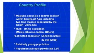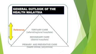 This document provides an overview of a lecture on professional development and practice in Malaysian healthcare. It introduces the Malaysian healthcare system and notes that the community is made up of diverse cultures. Physiotherapists must be aware of cultural assumptions and differences between hospital cultures and patients' familiar environments. The lecture also addresses areas of professional practice like medico-legal aspects, autonomy, and administration.