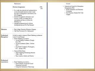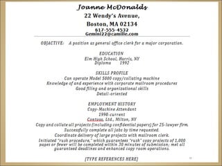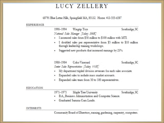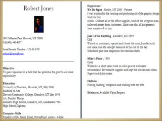 The document provides tips for writing and updating a resume. It emphasizes highlighting strengths, researching the company, and tailoring the resume to the specific position. It recommends using a consistent format with no errors, including key sections like name, address, phone number and email. Accomplishments should be quantified to demonstrate how the applicant helped the company. Common errors to avoid include using first-person pronouns and including unnecessary personal details.