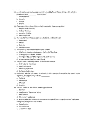 The document contains a multiple choice test with questions about education, teaching philosophies, learning theories, and classroom management. It asks about concepts like the whole child approach, types of intelligence, Bloom's taxonomy, Gardner's theory of multiple intelligences, and Kounin's with-it-ness principle of classroom management. The test contains questions to assess knowledge of educational psychology and best practices for teaching.