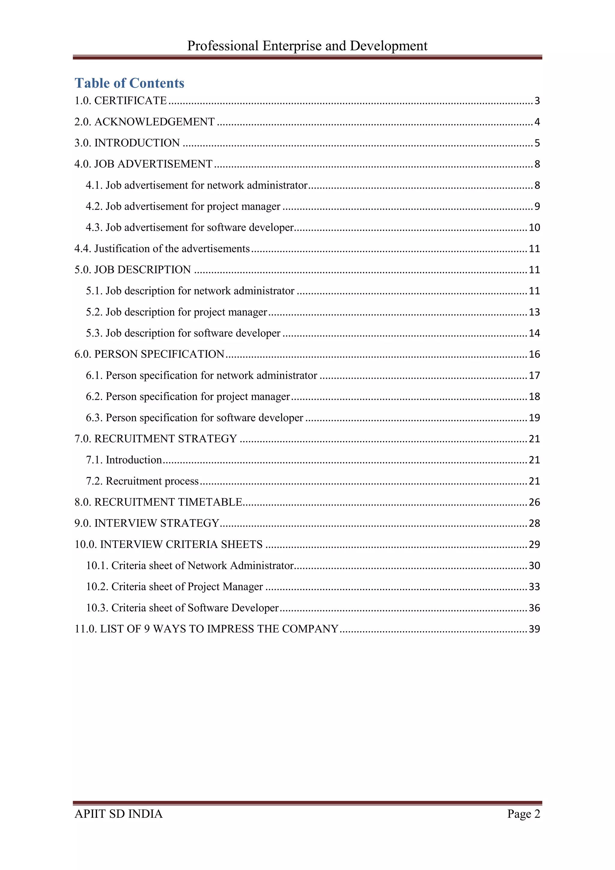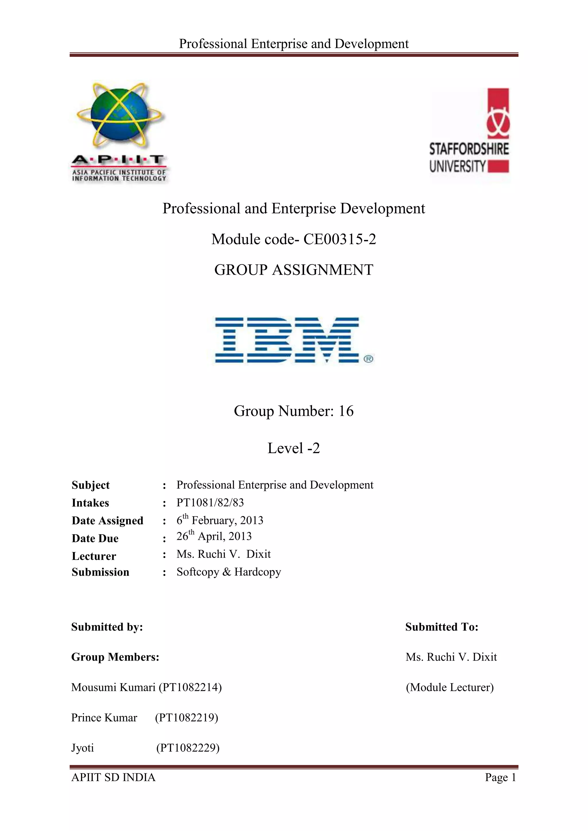 The document details a group assignment for developing a recruitment strategy for IBM, including job advertisements, descriptions, personal specifications, and interview strategies for three positions: Network Administrator, Project Manager, and Software Developer. The project emphasizes the importance of professional enterprise development and includes contributions from team members under the guidance of their lecturer, Ms. Ruchi V. Dixit. It also highlights the skills, qualifications, and recruitment processes relevant to each job role.