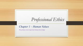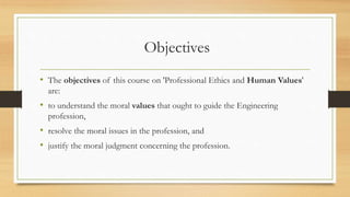 The document discusses the objectives and key concepts of professional ethics and human values. It aims to understand the moral values that should guide engineering work, resolve moral issues in the profession, and justify moral judgments. It defines terms like morals, values, ethics, integrity, and virtues. It also discusses concepts like work ethics, service learning, respect, living peacefully, caring, sharing, honesty, courage, valuing time, cooperation, commitment, empathy, self-confidence, challenges in the workplace, and spirituality.