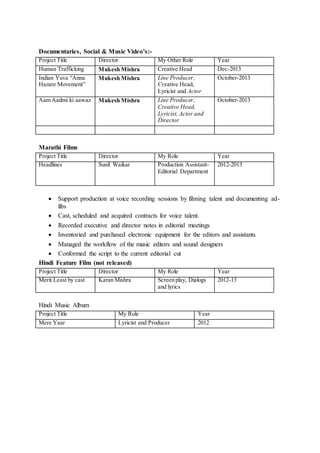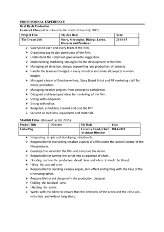 The document summarizes the professional experience of an individual in the film industry. It lists their roles in several films and documentaries from 2012-2015, where they served as director, producer, creative head, screenplay writer, dialog writer, lyrics writer, assistant director, and production assistant. Their responsibilities included supervising film teams, managing operations and budgets, developing creative concepts, and directing actors.