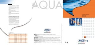 Aqua offre una serie di prodotti di filtrazione professionale di alta qualità, sottoposti a rigorosi controlli e test prima della commercializzazione. L'azienda investe in tecnologia e attrezzature all'avanguardia, mantenendo un team di tecnici altamente qualificati per garantire prestazioni ottimali. I modelli disponibili includono contenitori di polipropilene progettati per gestire elevate portate d'acqua, con diverse opzioni di microne e attacchi per le esigenze industriali.