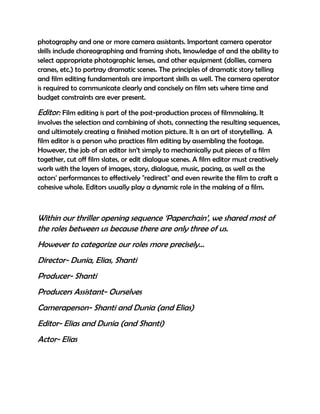 The document defines and describes several key roles in film production including producer, director, production assistant, cameraperson, and editor. The producer initiates and oversees the entire filmmaking process. The director visualizes the screenplay and guides the cast and crew. Production assistants help with various on-set tasks. The cameraperson operates the camera and collaborates on shots. The editor assembles footage and crafts the narrative. Within the opening sequence 'Paperchain', the roles were shared between the three filmmakers due to their small team size.