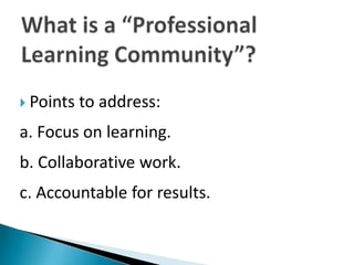 A professional learning community is defined as having three key aspects: 1) a focus on learning and ensuring all students learn, 2) collaborative work where educators work together to analyze and improve practices to promote deep learning, and 3) being accountable for results where effectiveness is judged based on student outcomes. The document provides examples of schools implementing professional learning communities through strategies like frequent progress reports, extra support for struggling students, and teacher collaboration to analyze student data and curriculum.