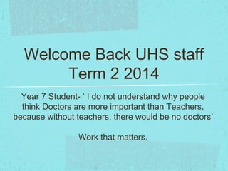 This document discusses digital portfolios for teachers and students at UHS. It suggests digital portfolios can serve two main purposes: as a space for learning, reflection, and social engagement; and to showcase capabilities and assessments. Digital portfolios are seen as evolving over three levels - from a storage space, to a workspace for immediate feedback, to a showcase of mature selections and reflections. The document provides examples of digital portfolios and discusses their potential strengths and limitations. Feedback is emphasized as important to improve teaching and learning.