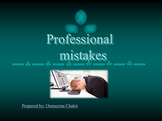 This document outlines types of professional mistakes and steps to resolve them. It discusses simple mistakes, big mistakes, and dangerous mistakes. Simple mistakes are minor but can still lead to dismissal. Big mistakes cannot be tolerated even temporarily. Dangerous mistakes intentionally harm the company. The steps to resolve mistakes are to assess the damage, admit responsibility, fix issues, prevent recurrences, and learn from the experience. Following these steps shows accountability and helps recover from mistakes gracefully.