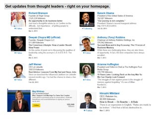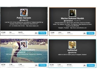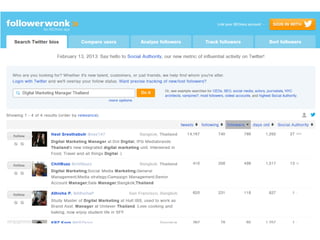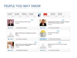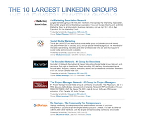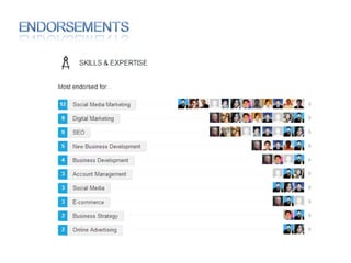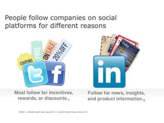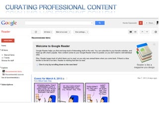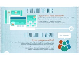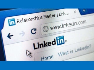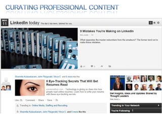 The document discusses using social media for professional purposes. It provides tips on using Facebook, Twitter, and LinkedIn to interact with customers, stand out professionally, and build personal brands. Specific guidance includes creating consistent, high-quality content across platforms; focusing on demonstrating expertise and value to others; and developing relationships through active participation in online conversations.