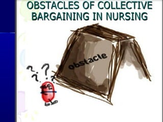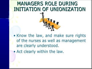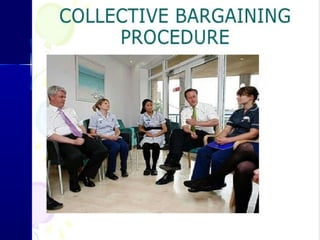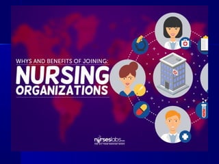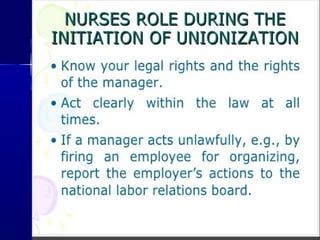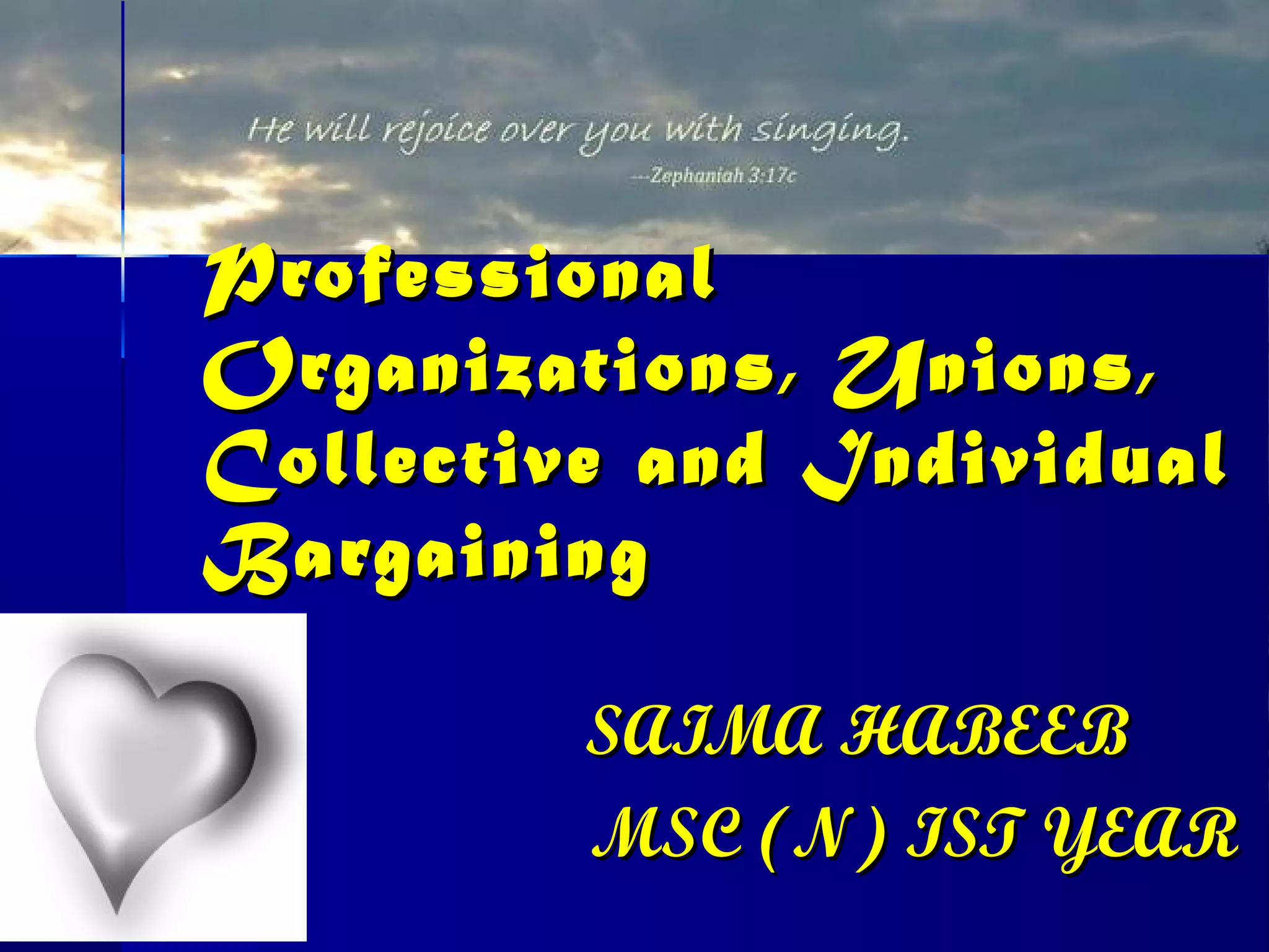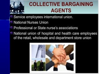 The document discusses the roles and functions of professional organizations and unions in nursing, emphasizing their importance in advancing the profession, setting educational standards, and influencing health policy. It outlines definitions, objectives, and membership structures of various organizations, including the International Council of Nurses and the American Nurses Association. Additionally, it highlights the concepts of collective bargaining, its importance for employees, and the different levels and types of bargaining practices.