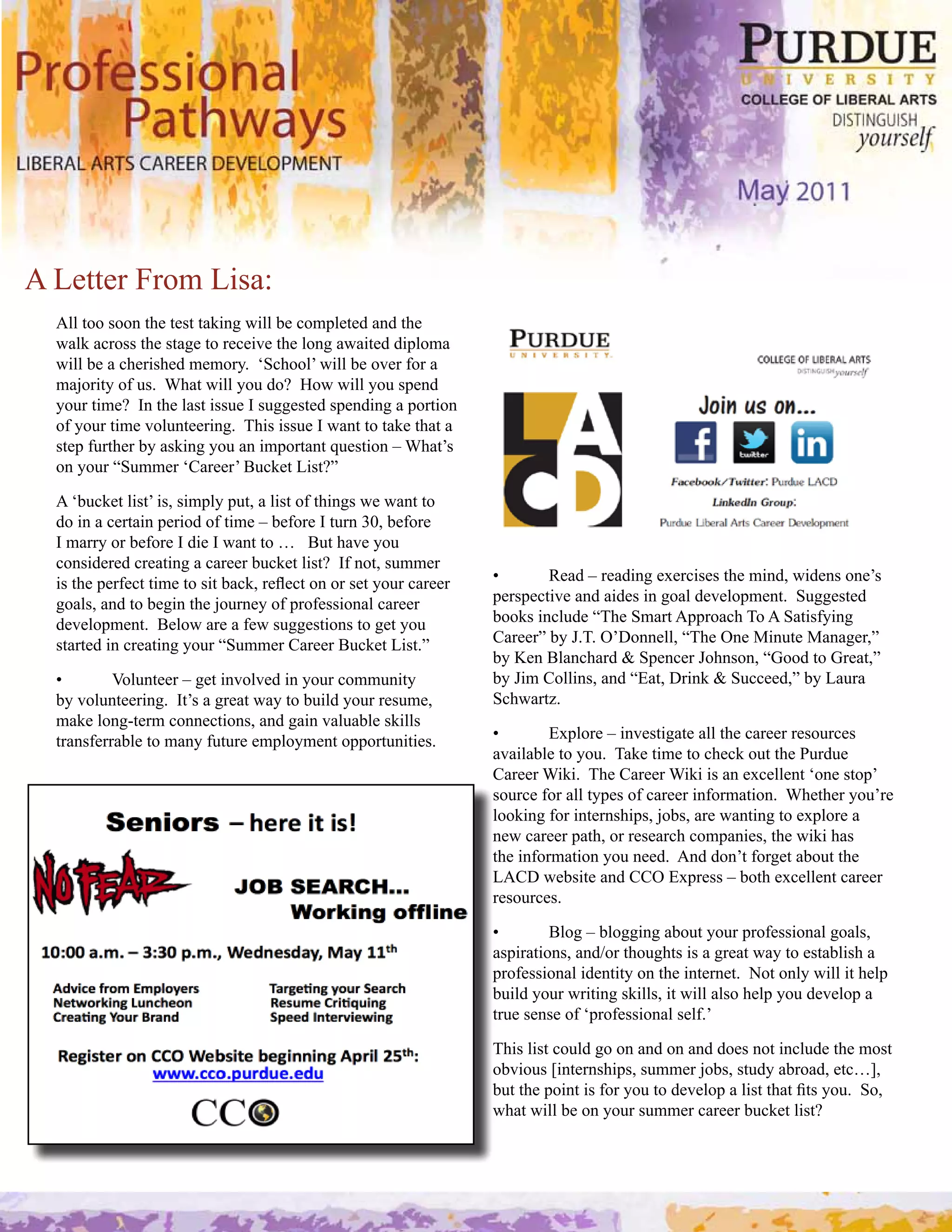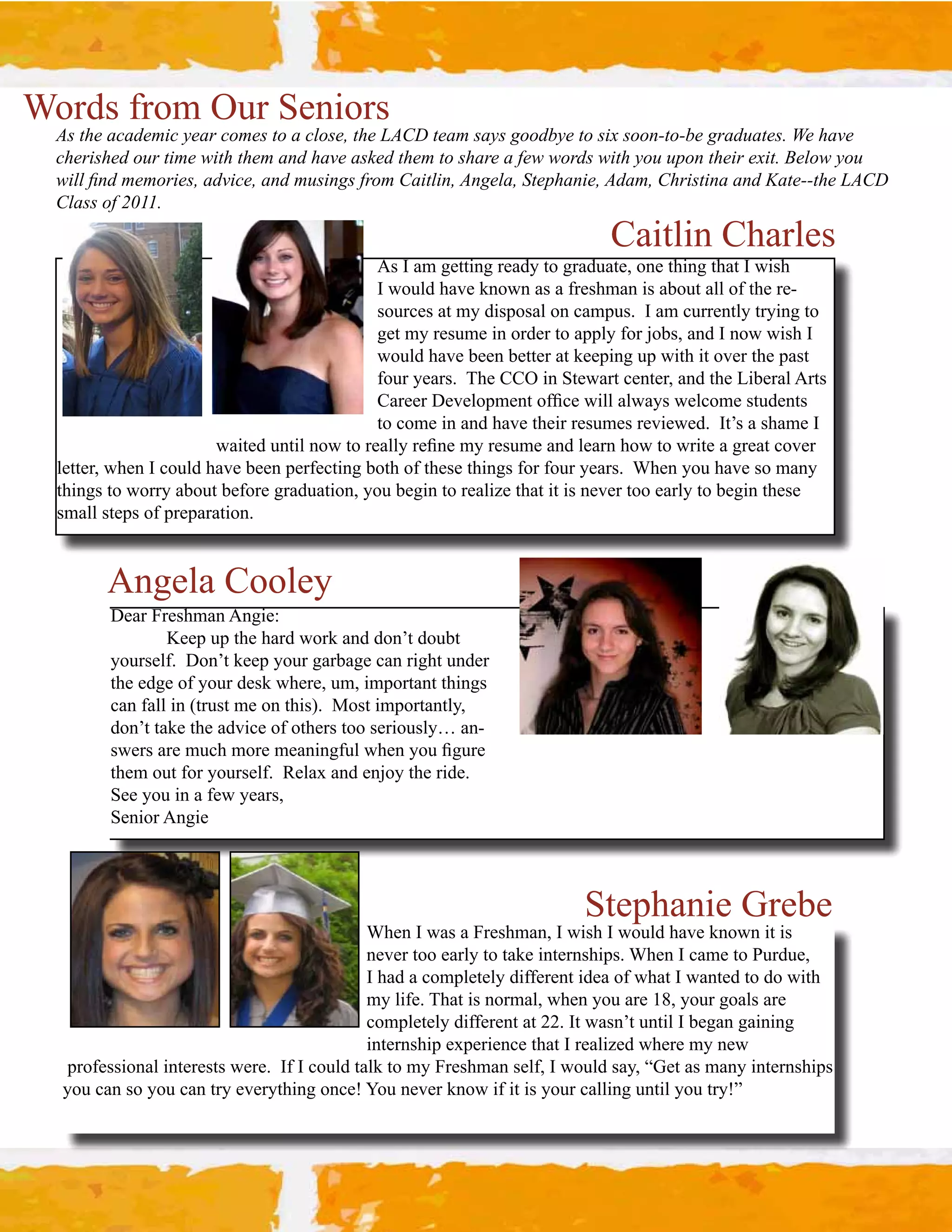 This document provides advice from seniors at Purdue University to their freshman selves. It includes tips on utilizing campus resources, gaining internship experience, time management, and getting involved on campus. The seniors reflect on things they wish they had known and advise freshmen to take advantage of career centers, pursue internships early, schedule classes carefully, make friends with advisors, and join student organizations.