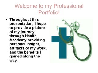 This portfolio summarizes Emily Cook's experience in the Health Academy program. It includes reflections on rotations in various hospital departments like the pediatric floor and NICU. It also provides artifacts from projects on medical careers, a research paper on child life specialists, and mentor evaluation forms. The portfolio demonstrates how the program prepared Emily for her goal of becoming a child life specialist and majoring in nursing with a focus on child and family development.