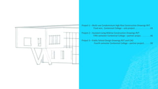 The document is a portfolio of architectural projects by J. Luise McTaggart, detailing three key projects: a multi-use condominium high-rise, an assisted living mid-rise, and a public school design. Each project incorporates sustainable practices and innovative design approaches tailored to specific community needs, including amenities and green building technologies. The portfolio illustrates a collaborative design process and a focus on economic functionality while maintaining aesthetic appeal.