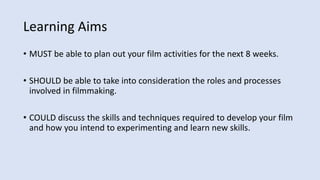 The document provides guidance on creating an 8-week career plan for a film project, outlining key processes like location scouting, actor auditions, finalizing scripts and storyboards, and filming. It describes the skills needed for each process, such as taking location photos, researching access and permissions, creating audition advertisements, producing script breakdowns and call sheets, and storyboarding camera angles and lighting. Students are instructed to plan out and track their film activities and skill development over the next 8 weeks.