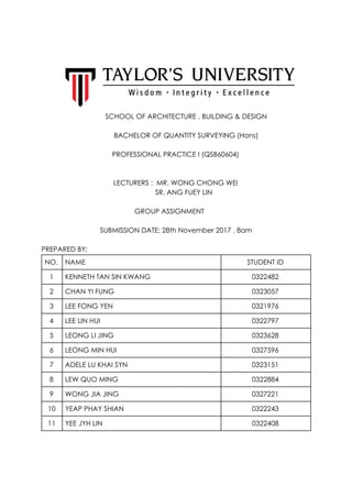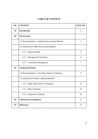 This document outlines the group assignment for a quantity surveying course. It recommends the traditional procurement method, two stage selective tendering process, and lump sum contract using the PAM 2006 form for a proposed extension project of the Kuala Lumpur Twin Towers. The traditional method provides the client with lower cost and quality risks while allowing design control. Two stage selective tendering reduces the risk of selecting inexperienced contractors through pre-qualification. The lump sum contract and PAM 2006 form distribute risks fairly and are widely accepted in Malaysia.