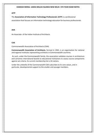 The document outlines various professional organizations and regulatory bodies related to architecture in India, including the Foreign Investment Implementation Authority (FIIA), the Indian Institute of Architects (IIA), and the Council of Architecture (COA). It highlights their roles in promoting architectural practices, setting educational and professional standards, and the process of registration for architects. Additionally, it discusses the responsibilities and ethical conduct expected from architects in their professional practice.
