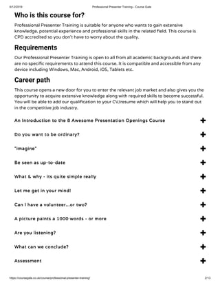 The Professional Presenter Training course aims to equip participants with essential skills for planning, preparation, and delivery of effective presentations. It covers various techniques to engage diverse audiences and is accessible to anyone regardless of academic background, providing a CPD accredited qualification. Completing the course enhances job market prospects by adding valuable skills to participants' CVs.