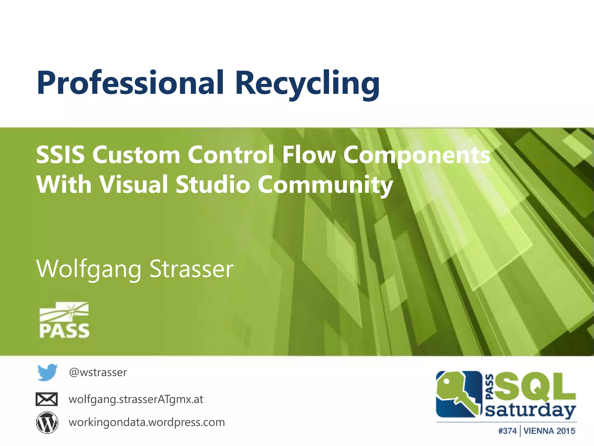 This document discusses creating custom control flow components for SQL Server Integration Services (SSIS) using Visual Studio Community. It covers the development environment, creating a new custom component project, deploying the component, accessing variables, debugging, internationalization, and best practices like automated builds and versioning. The presenter demonstrates creating a simple component that reads and writes variables, validating properties, and handling events.