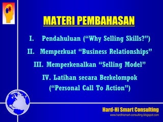 Pelatihan keterampilan penjualan membahas model penjualan, mendengarkan pelanggan, dan membangun hubungan bisnis. Tujuannya adalah meningkatkan kinerja penjualan dan memberikan nilai tambah kepada pelanggan.
