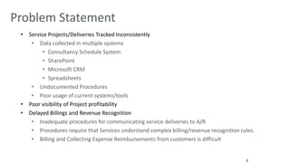 The document outlines issues related to inconsistent tracking of service projects and multiple systems for data collection, leading to poor visibility of project profitability and delayed billing. It proposes implementing a PSA system to streamline operations, improve project management and forecasting, and enhance overall business intelligence while reducing resource strain. The implementation costs are detailed, along with a project timeline for transition and data migration.