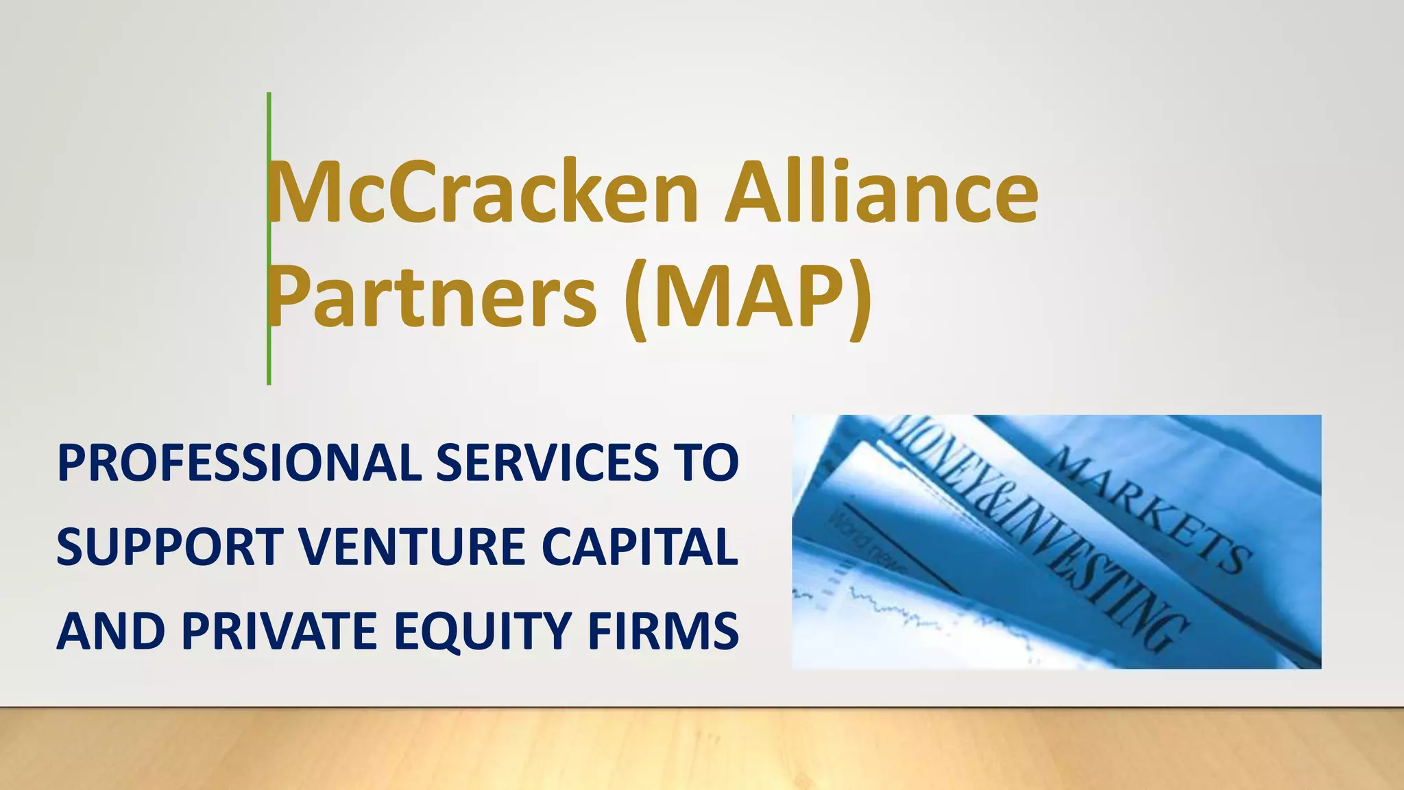 MAP provides professional services to support venture capital and private equity firms, including serving on advisory boards, managing the office of the CFO, addressing capital formation issues, and supporting M&A transactions. Bob Dickson is a partner at MAP who has experience as CFO of companies that were sold, such as CardiacAssist which was sold for $250 million. MAP works with a network of CFO advisors across the US to provide local and national services and links clients to technical expertise.