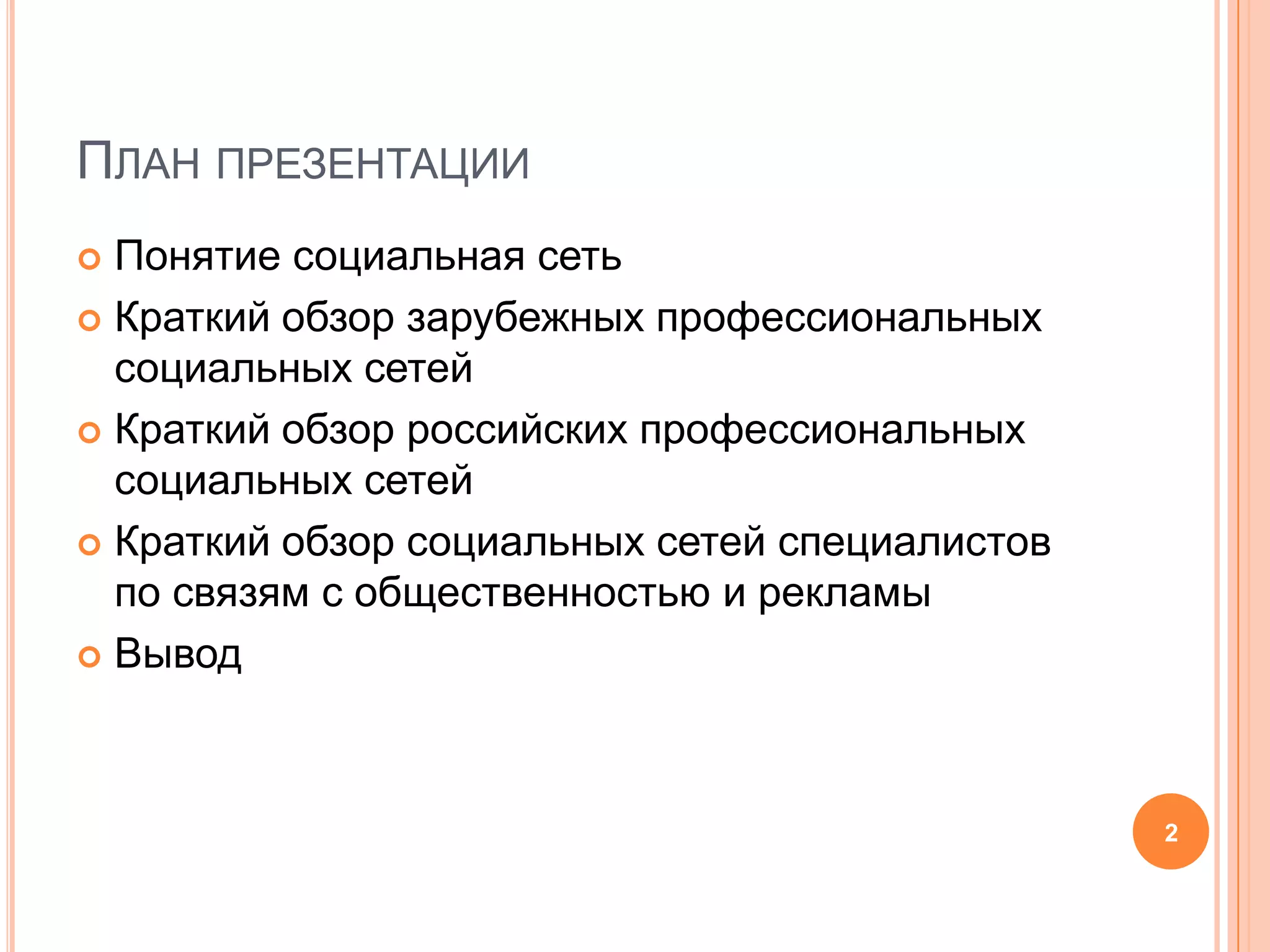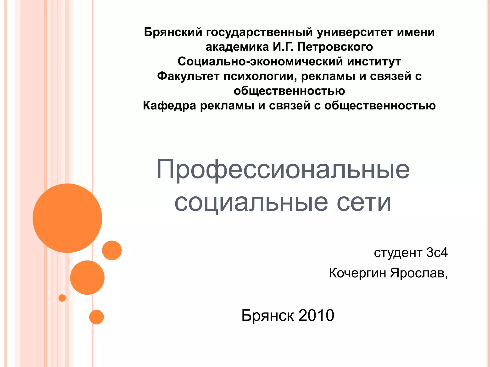 Документ представляет собой презентацию о профессиональных социальных сетях, включая обзоры таких платформ, как LinkedIn, My Circle и Хабр. Обсуждаются особенности их функционирования, целевая аудитория и преимущества для специалистов в различных областях. В заключение подчеркивается, что специализированные социальные сети обладают высокой целевой аудиторией, однако общий интерес к новым проектам снижается.