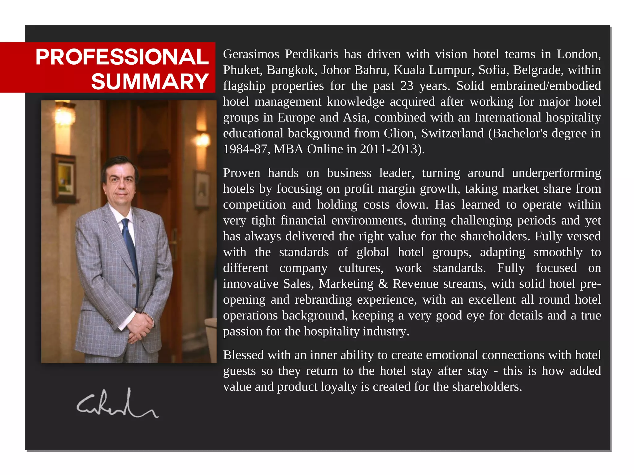 Gerasimos Perdikaris has over 23 years of experience in hotel management, working in flagship properties across Europe and Asia. He has a proven track record of turning around underperforming hotels and delivering sustainable profits through optimizing revenue and reducing costs. Perdikaris is currently studying for an MBA in international hospitality while serving as General Manager of a luxury hotel in Belgrade, where he is leading pre-opening and rebranding efforts.