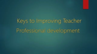 Professional development is an ongoing process that supports employees in better understanding their work environment, job duties, and improving job performance. It includes preservice training like formal education programs, inservice training through professional organizations or continuing education, and self-development activities like research, observations, and presentations. Effective professional development provides conceptual information, practice, and feedback to employees. It also uses developmental relationships, goal setting, interactive learning, and feedback to promote skills and career growth.