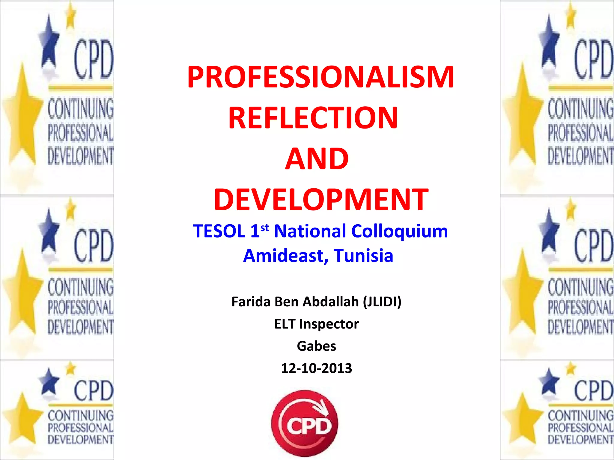 This document outlines the key aspects of professionalism and development for teachers. It discusses the difference between a "teacher pleaser" and a professional teacher, with the professional teacher mastering their subject, engaging in lifelong learning, and being reflective and innovative. It also defines teaching as a profession rather than just a job due to its standards and demands. The document emphasizes that professional teachers are reflective practitioners who continually strive to improve. It explores how reflection involves collaboration, self-evaluation, and critical thinking. Continuous professional development is presented as essential for teachers to manage their own learning and development. The document concludes by providing a recap of the reflective professional teacher's characteristics and a practice activity.