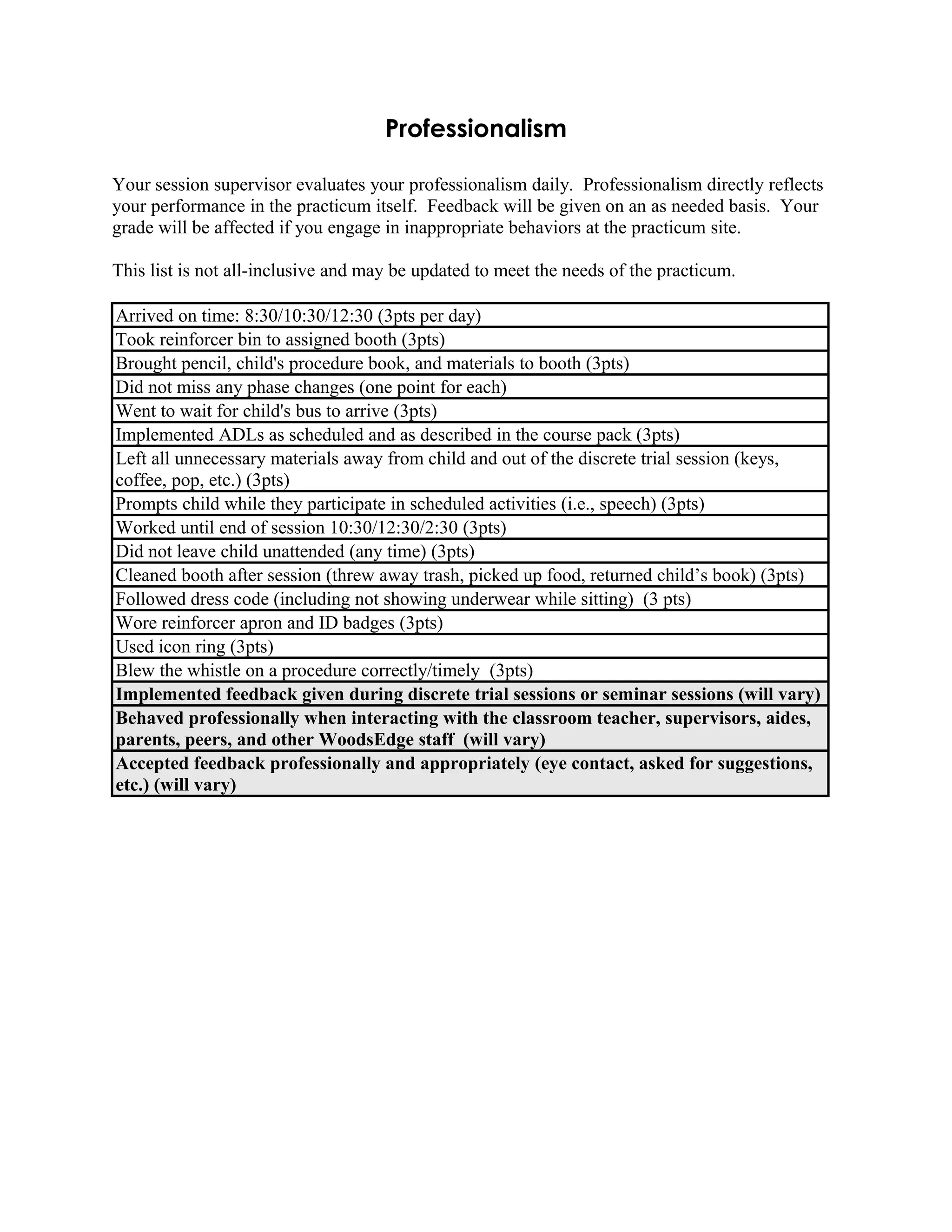 Your professionalism is evaluated daily at your practicum site. This includes arriving on time, following the dress code, implementing discrete trial instruction as instructed, and accepting feedback professionally. Your grade can be affected by inappropriate behavior. The expectations aim to ensure you conduct yourself appropriately for an educational setting and interact respectfully with students, staff, and parents.