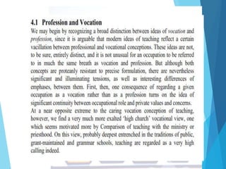 This document discusses professionalism in teaching. It outlines the objectives of the course which are to explain concepts like profession, professionalism, and teaching as a profession. It will also discuss attributes of professional teachers, the changing role of teachers, and ethical issues. The introduction defines professions and their characteristics like requiring advanced training, rendering public service, and being based on specialized skills. It describes teaching as an activity that intends to contribute to education and discusses conceptions of teaching as a profession. It also lists characteristics of effective teaching such as aligning curriculum goals and scaffolding feedback.