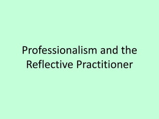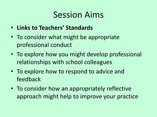 The document provides guidance for student teachers on developing professionalism, including reading key school policies, maintaining appropriate conduct and relationships with colleagues, responding effectively to feedback, and taking a reflective approach to continuously improve one's teaching practice. It also offers scenarios and questions to help students strengthen their reflection skills and better understand how to have productive conversations with their mentors about observation feedback.