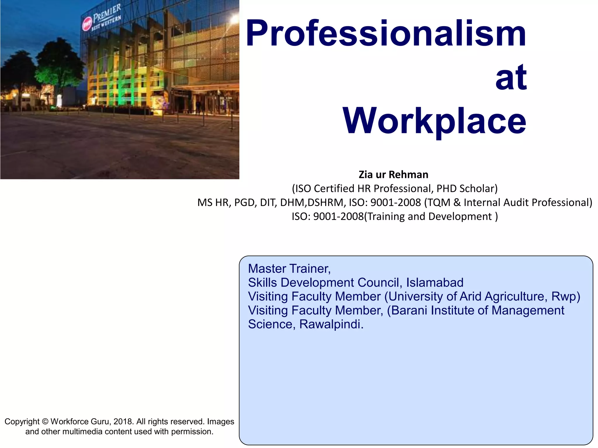 The document discusses professionalism in the workplace. It defines professionalism as a specific style of behavior in the workplace and the conduct and qualities that characterize a profession. It notes that professionalism is judged by unwritten rules, codes of conduct, culture, expectations and standards. It provides examples of both professional and unprofessional behavior.