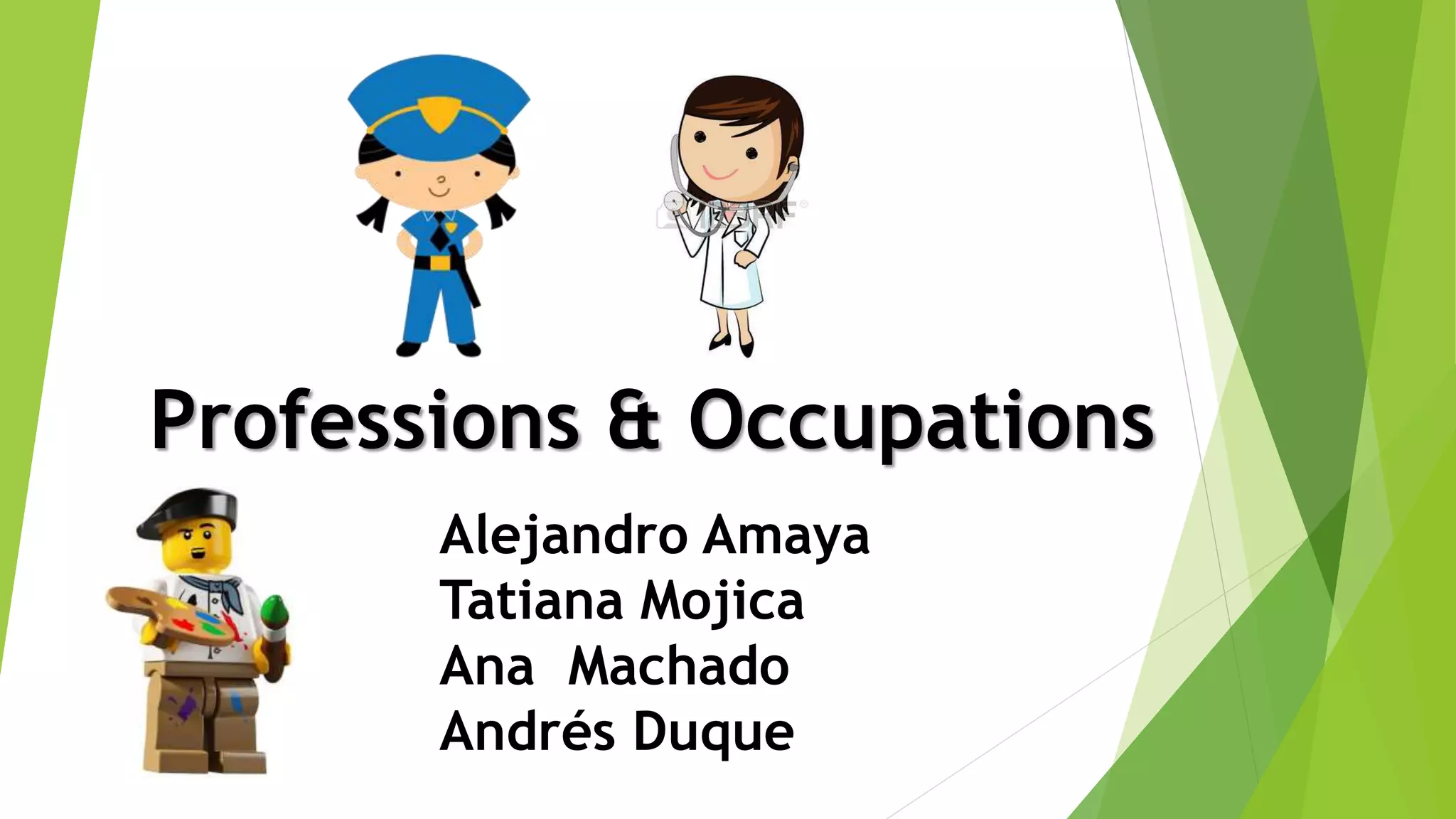 This document defines a profession and provides examples of common professions, including their brief definitions. It asks the reader to consider the professions of their family members. The document concludes by asking readers to choose a profession, find props to represent that profession, and then act out or present that profession to the group.