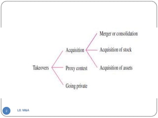This document discusses mergers and acquisitions (M&A) and provides an overview of key concepts in 3 sections. Section 1 discusses values that can be obtained from M&A. Section 2 covers M&A practices, including effects of takeovers, anti-takeover devices, and other concepts. Section 3 lists various valuation methods used in M&A transactions.