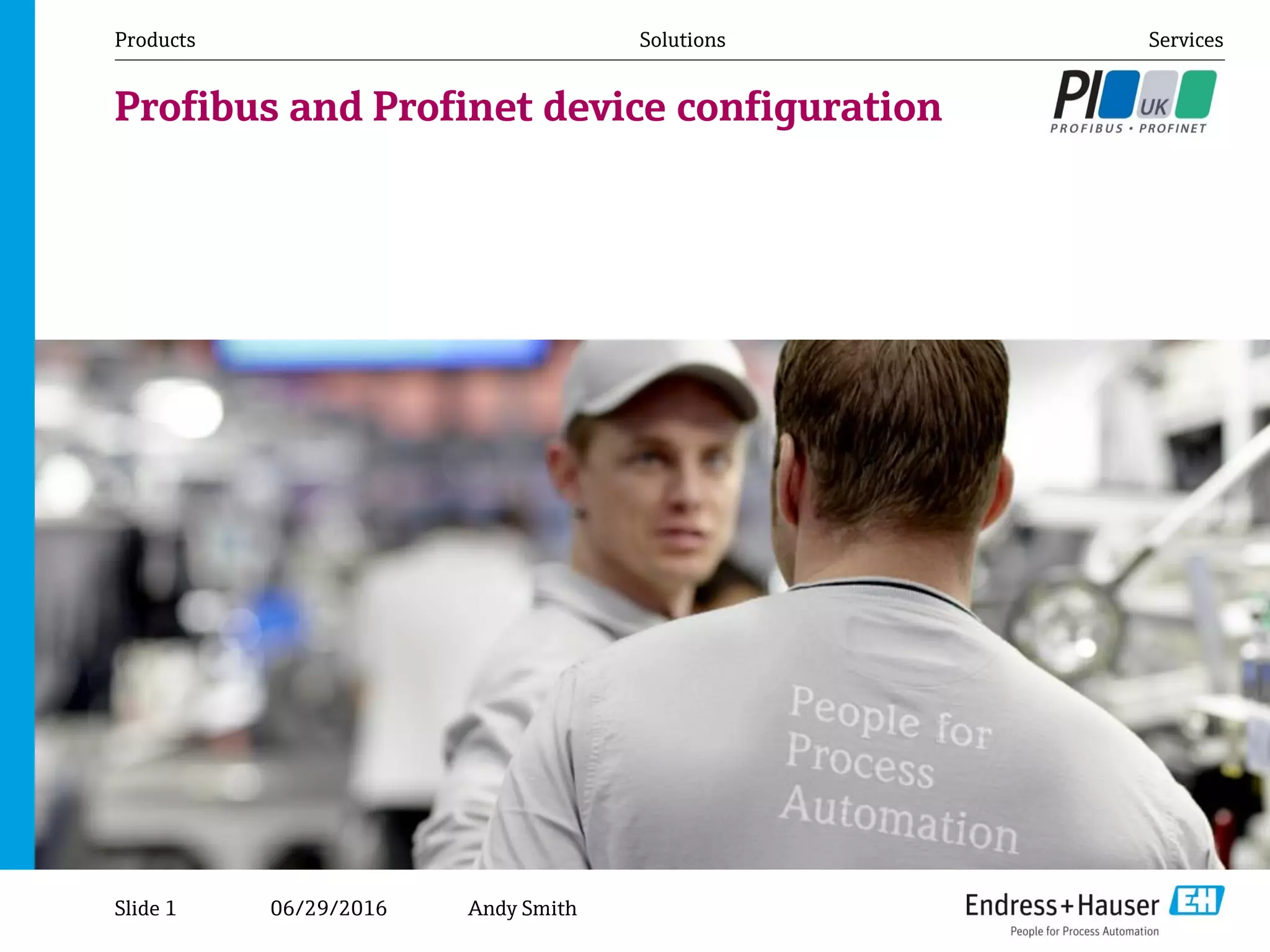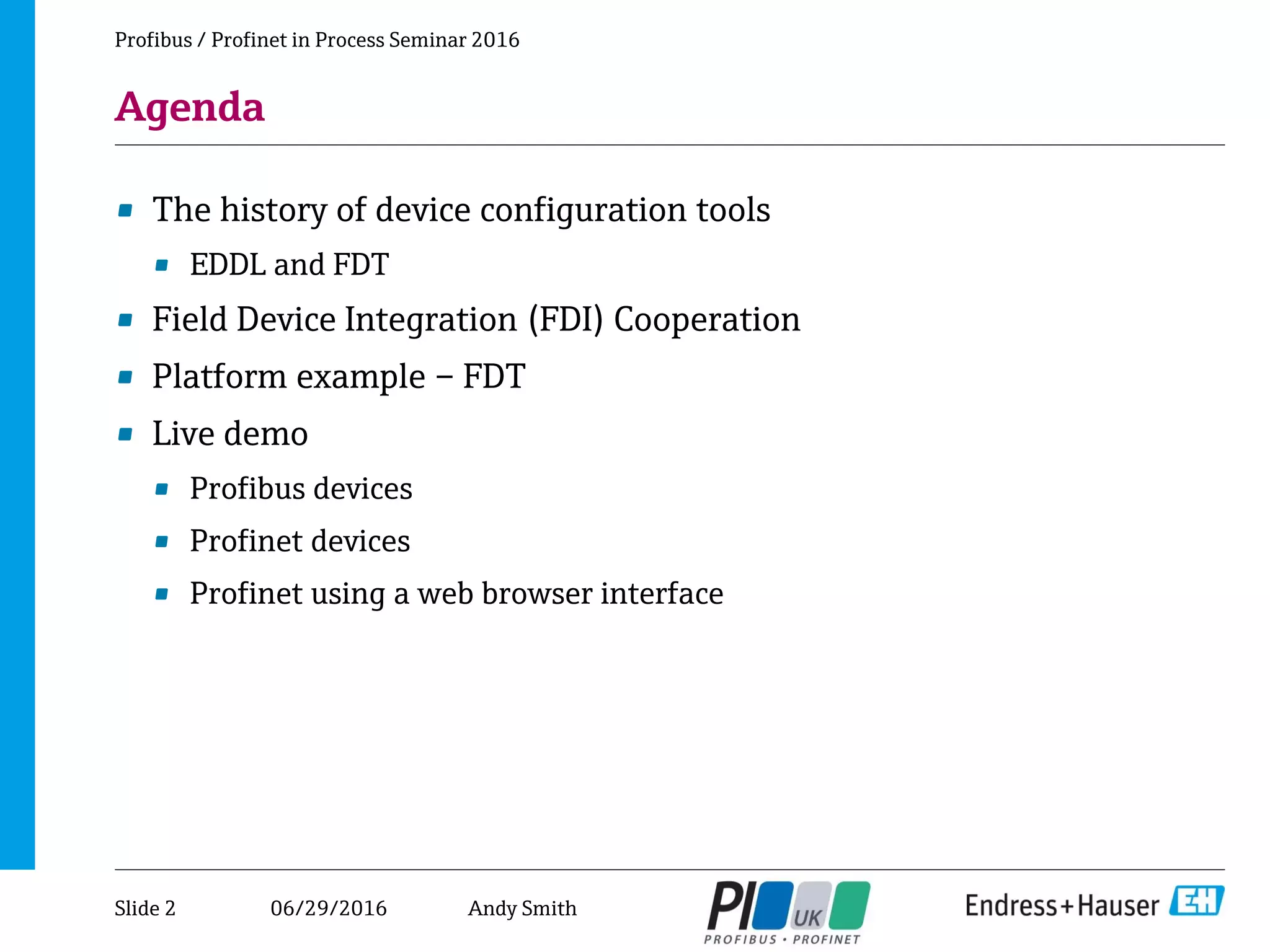 This document summarizes Andy Smith's presentation on configuring Profibus and Profinet devices. The presentation covers the history of device configuration tools including EDDL, FDT, and FDI. It also demonstrates configuring Profibus devices over ProfiUSB and Ethernet gateways as well as Profinet devices via an FDT frame and web browser interface. A live demo is included to showcase configuration of Profibus PA devices and Profinet devices.