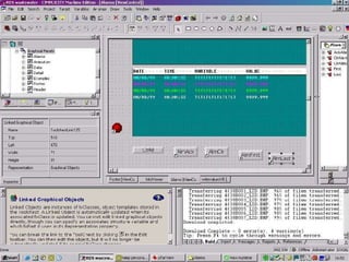 This document discusses setting up and configuring alarm groups and alarms in a toolchest application. It covers creating alarm groups and subgroups to organize alarms, assigning points to groups, setting properties for digital and analog alarms, and placing an alarm object on a HMI screen to view alarms. Help and scripting options for alarms are also mentioned.