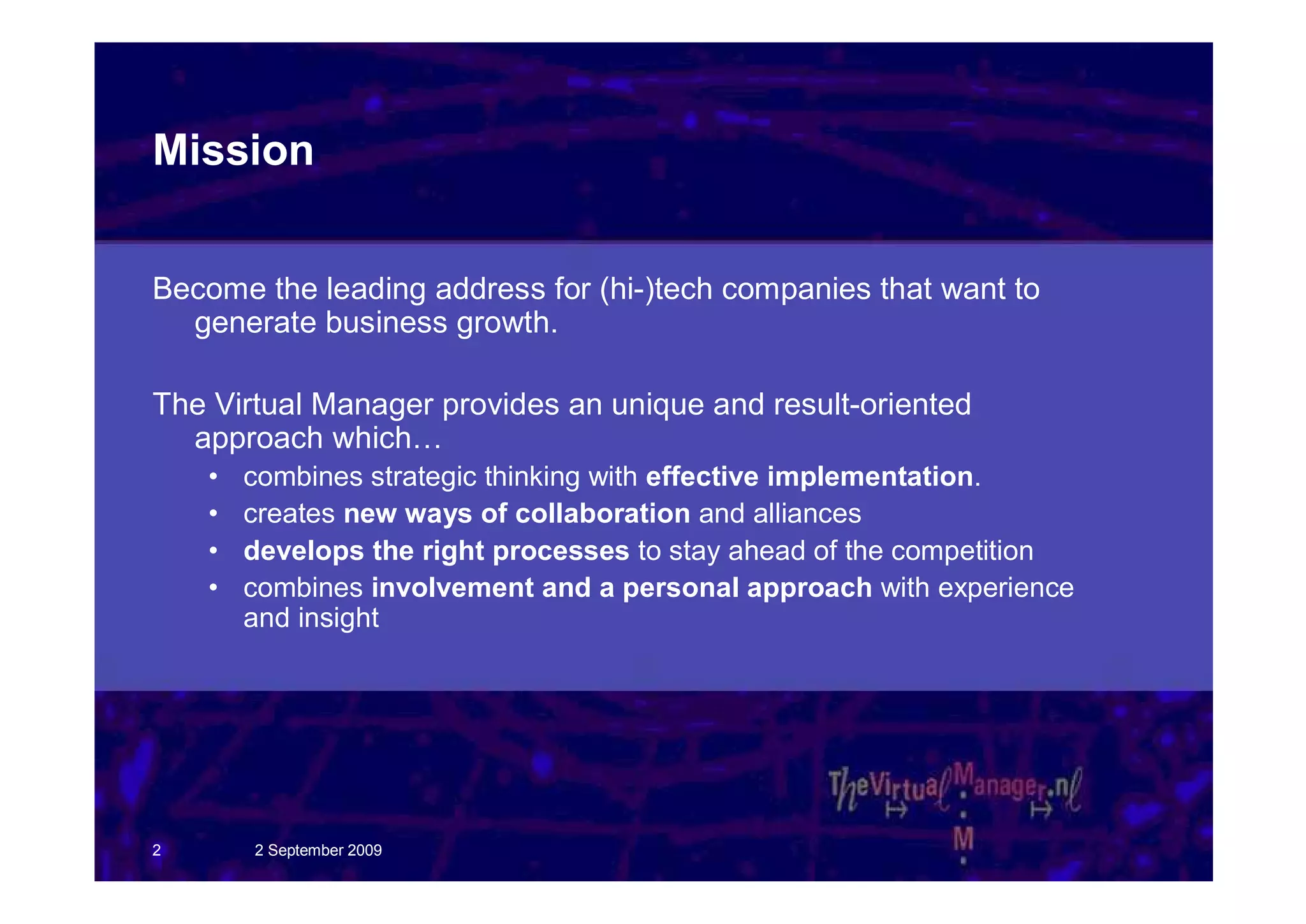 The Virtual Manager provides strategic consulting services to help technology companies accelerate business growth. It takes a unique, results-oriented approach that combines strategic thinking with effective implementation. The company's mission is to become a leading address for hi-tech companies seeking business growth. The Virtual Manager is committed to realizing and managing business acceleration for its customers. It has experienced managers who work on customer business projects through a hands-on or advisory approach.