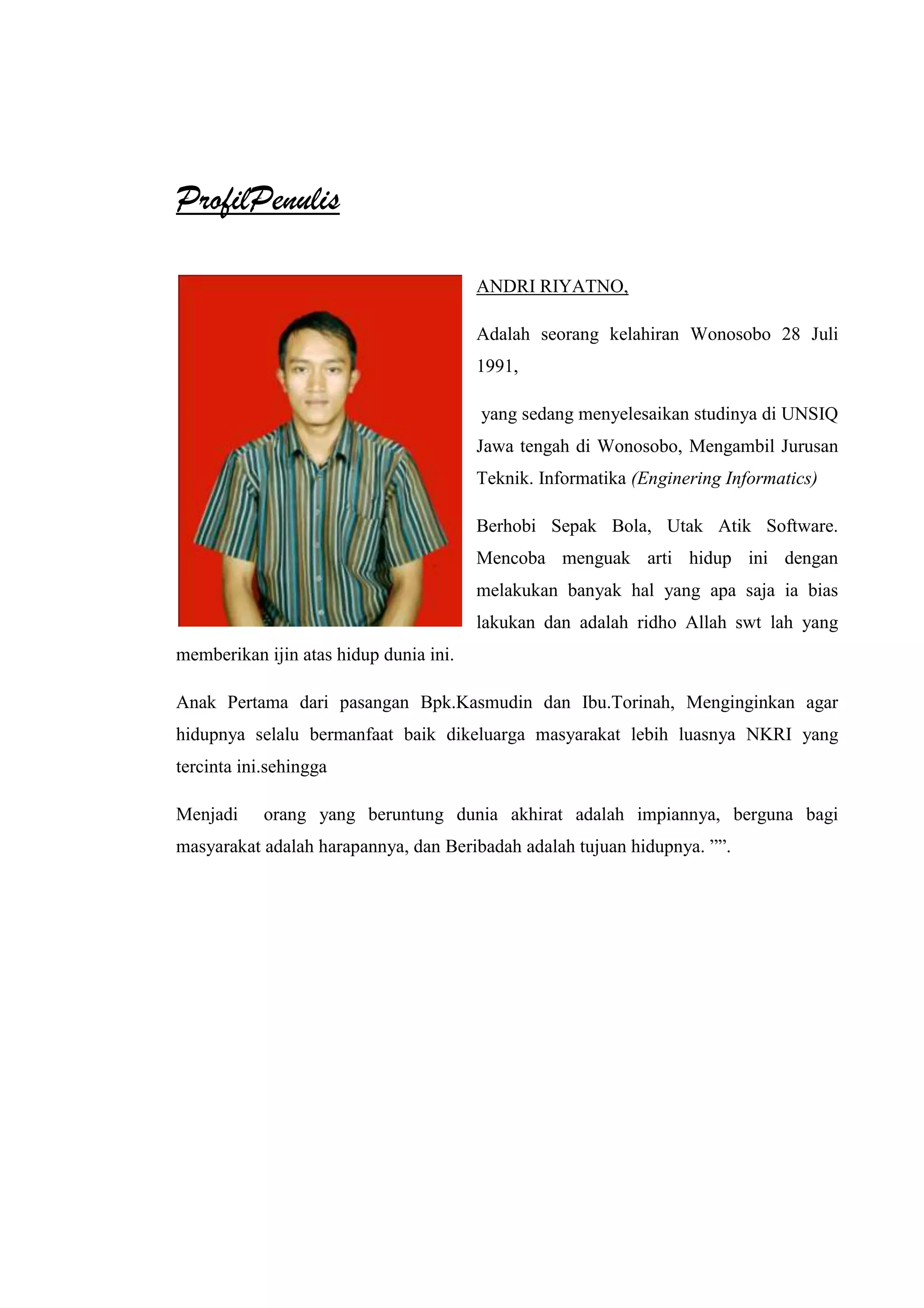 Andri Riyatno, lahir di Wonosobo pada 28 Juli 1991, merupakan mahasiswa teknik informatika di Unsiq Jawa Tengah dengan hobi sepak bola dan pengembangan perangkat lunak. Sebagai anak sulung, ia berkeinginan untuk memberikan manfaat bagi keluarga dan masyarakat, serta mengejar tujuan hidup yang bermanfaat dan beribadah. Ia percaya bahwa hidupnya diberikan izin oleh Allah SWT dan berusaha untuk menjadi orang yang beruntung di dunia dan akhirat.