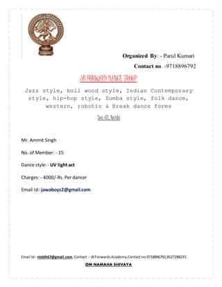 The document provides information about the JB Forward Dance Troop organized by Parul Kumari. The troupe has 15 members and performs various dance styles like jazz, bollywood, contemporary, hip-hop, zumba, folk, western, robotic and break dancing. It is located in Sector 62, Noida and led by Ammit Singh. The troupe charges Rs. 4,000 per dancer and can be contacted via the phone numbers or email ids provided for booking UV light dance acts.