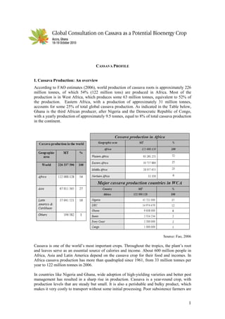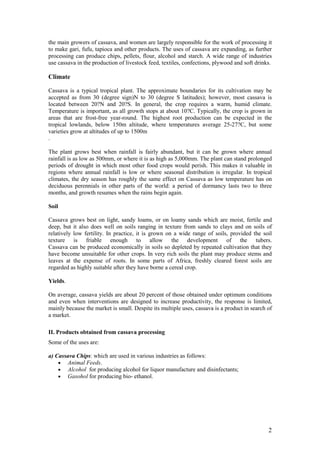 Cassava is a staple crop for over 600 million people and is primarily grown in Africa, Asia, and Latin America. In 2006, global cassava production was approximately 226 million tonnes, with over half (122 million tonnes) produced in Africa, primarily in West and East Africa. Nigeria is the world's largest cassava producer. Cassava thrives in tropical climates between 30 degrees north and south latitude and grows well in a variety of soils as long as they are well-draining. Cassava can be processed into chips, starch, flour and ethanol and is used in industries like animal feed, food and beverages, paper, and biofuels.