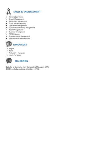 S Krishnan has over 37 years of experience in banking operations and branch management with Canara Bank. He has expertise in areas such as banking operations, branch management, retail asset management, credit risk management, and business development. Krishnan led a team that inspected over 700 branches in Kerala and was selected to head the foreign operations of an exchange company in Dubai for three years. He is now seeking a new challenge that utilizes his leadership and banking experience.
