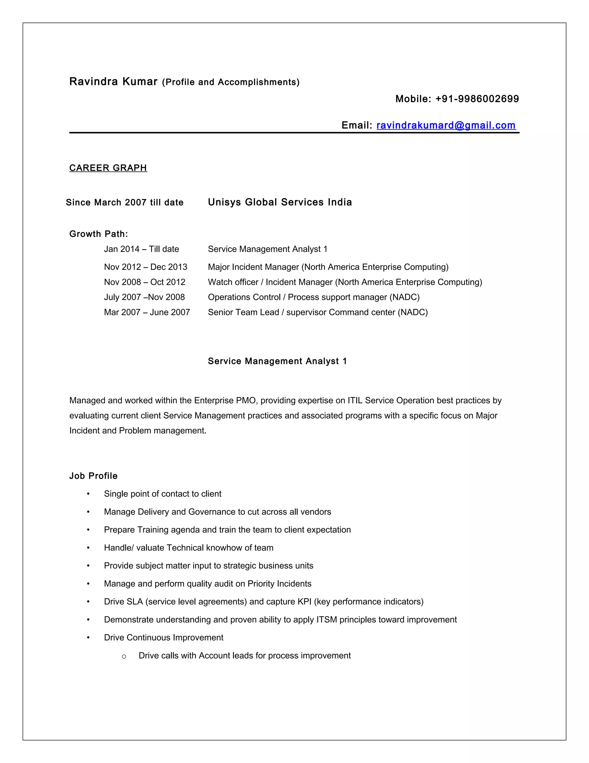 This document provides a summary of Ravindra Kumar's career and accomplishments. It outlines his roles and responsibilities in service management roles at Unisys Global Services India since 2007. Key responsibilities included managing major incidents, driving process improvements, and achieving targets for incident resolution times. Notable accomplishments include an 84.5% reduction in priority 1 incident resolution times, achieving service level targets, and receiving appreciation from customers for his work.