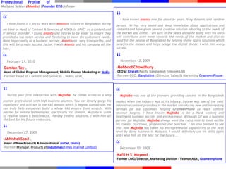 The document provides a professional profile of Mujtaba Sattar, the founder and CEO of Inforev. It includes recommendations from past clients and partners praising Mujtaba's experience, skills, work ethic, creativity in solving problems, and leadership in building Inforev into a successful mobile content and solutions provider in Bangladesh and other countries. It also outlines Inforev's services, clients, partnerships with mobile operators, and Mujtaba's role in pioneering mobile governance and agricultural information services in Bangladesh.