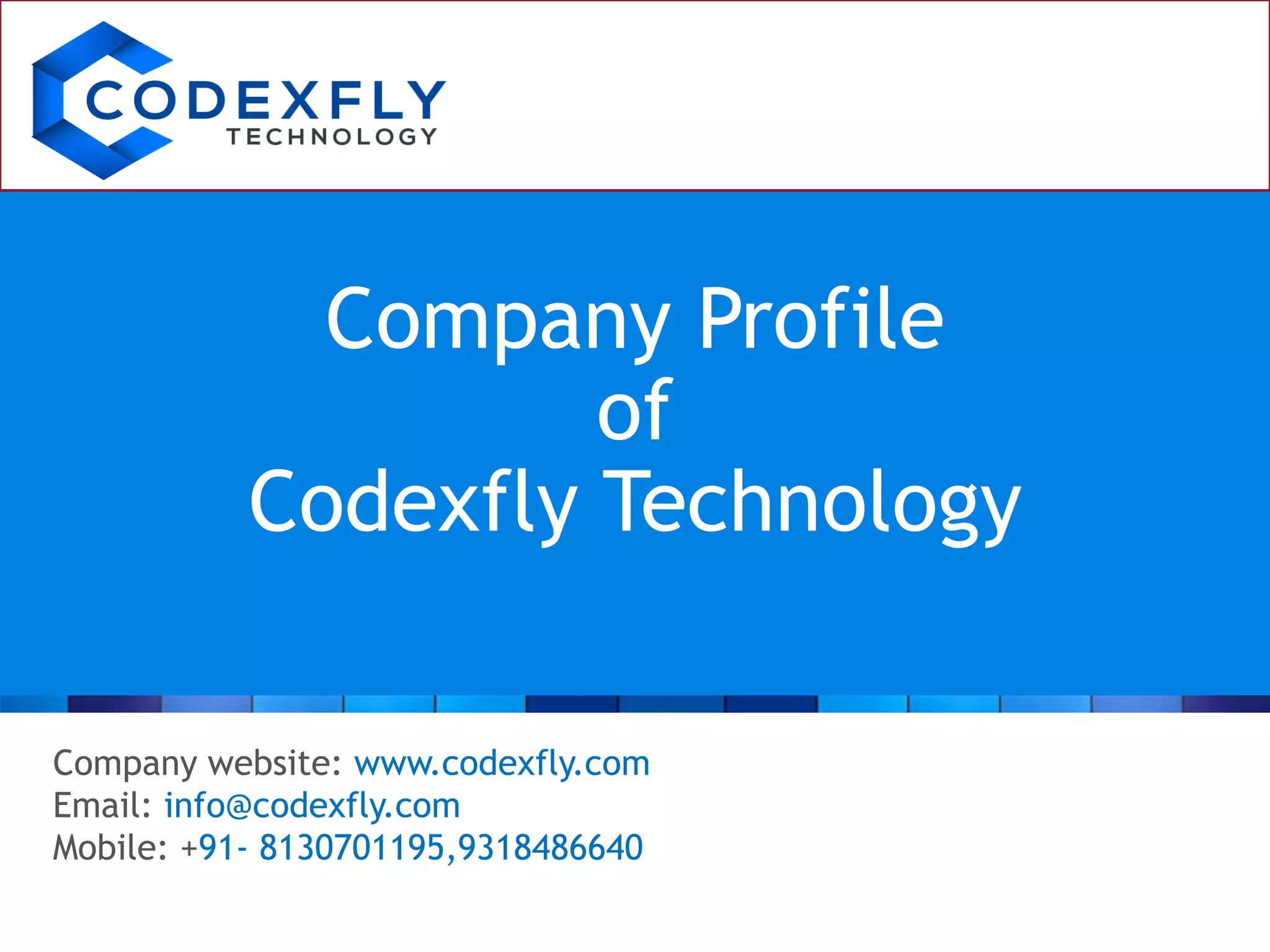 Codexfly Technology is an Indian software development company focused on delivering affordable and innovative solutions to enhance clients' businesses across various sectors. Their services include web and mobile app development, SEO, web promotion, and hardware solutions, aiming for high customer satisfaction and continuous improvement. With a commitment to leveraging new technologies, they customize their approach for businesses of all sizes to achieve optimal marketing and operational success.