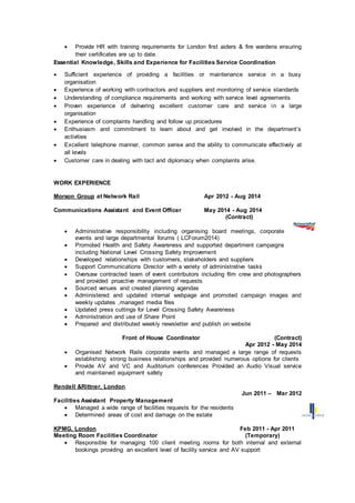 This document provides a profile and work experience summary for Stephen Rickerd. He has over 25 years of experience in facilities management, event coordination, and customer service roles. Currently, he works as a Facilities Coordinator for Watts Group, where he manages maintenance, cleaning, security, IT, health and safety, and more. He is seeking a new challenging position that utilizes his expertise in facilities processes, relationship building, and providing responsive customer service.