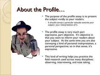 The profile essay aims to vividly present its subject to readers while conveying the writer's perspective. It balances objective information with subjective interpretation. Writers describe their subject through narrative, anecdote, and dialogue while researching through observation and interviews. A good profile features an intriguing subject, vivid presentation through specific details rather than generalizations, and a dominant impression that shares the writer's insights with readers.