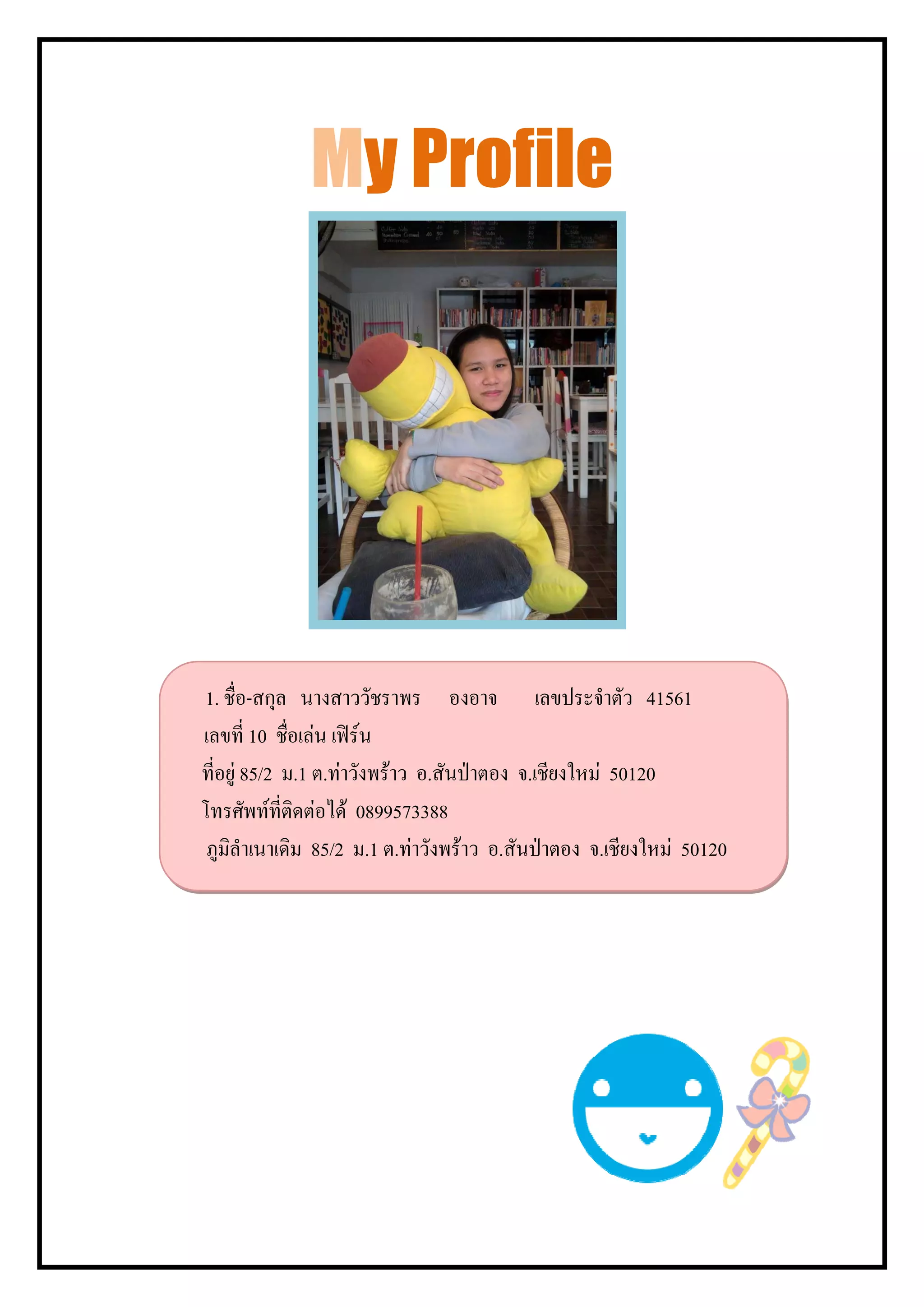นางสาววัชราพร องอาจ เลขประจําตัว 41561 เลขที่ 10 ชื่อเลน เฟรน ที่อยู 85/2 ม.1 ต.ทาวังพราว อ.สันปาตอง จ.เชียงใหม 50120 โทรศัพทที่ติดตอได 0899573388 ภูมิลําเนาเดิม 85/2 ม.1 ต.ทาวังพราว อ.สันปาตอง จ.เชียงใหม 50120