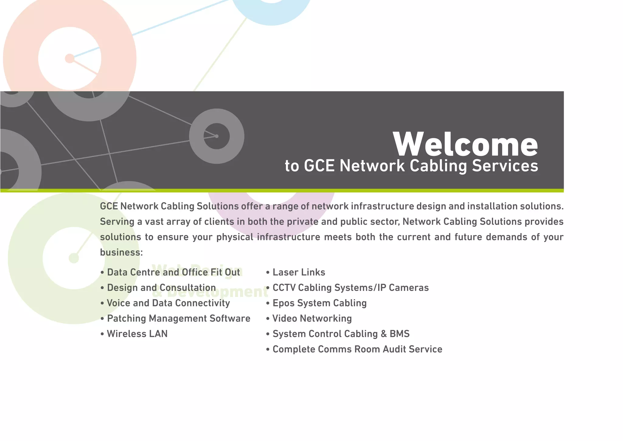 GCE Network Cabling Services offers a range of network infrastructure design and installation solutions. They provide solutions for data center fit outs, voice and data connectivity, wireless LANs, CCTV cabling, and more. GCE is a privately owned IT services company formed in 2002 that takes a customized approach to delivering technical solutions. They offer network cabling, IT support, voice and data services, web design, and IT consultancy.