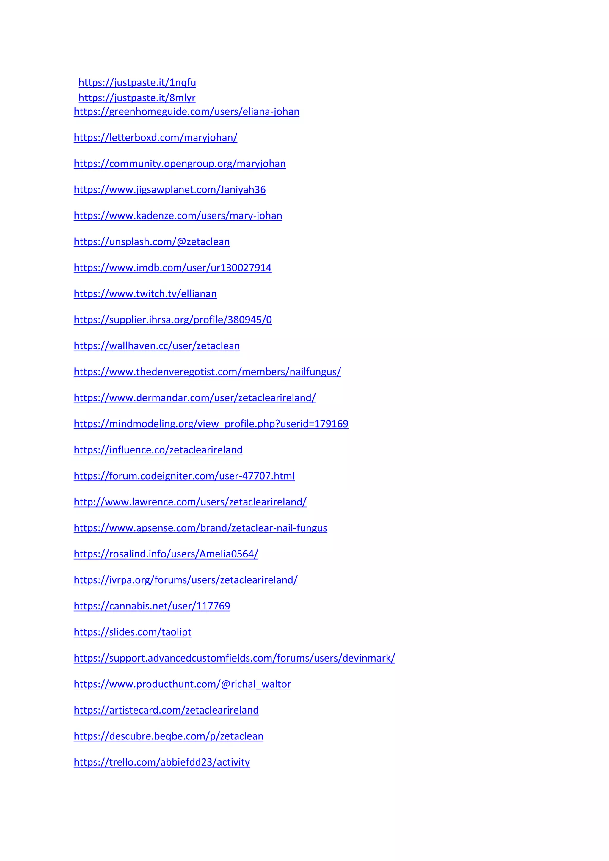 https://justpaste.it/1nqfu https://justpaste.it/8mlyr https://greenhomeguide.com/users/eliana-johan https://letterboxd.com/maryjohan/ https://community.opengroup.org/maryjohan https://www.jigsawplanet.com/Janiyah36 https://www.kadenze.com/users/mary-johan https://unsplash.com/@zetaclean https://www.imdb.com/user/ur130027914 https://www.twitch.tv/ellianan https://supplier.ihrsa.org/profile/380945/0 https://wallhaven.cc/user/zetaclean https://www.thedenveregotist.com/members/nailfungus/ https://www.dermandar.com/user/zetaclearireland/ https://mindmodeling.org/view_profile.php?userid=179169 https://influence.co/zetaclearireland https://forum.codeigniter.com/user-47707.html http://www.lawrence.com/users/zetaclearireland/ https://www.apsense.com/brand/zetaclear-nail-fungus https://rosalind.info/users/Amelia0564/ https://ivrpa.org/forums/users/zetaclearireland/ https://cannabis.net/user/117769 https://slides.com/taolipt https://support.advancedcustomfields.com/forums/users/devinmark/ https://www.producthunt.com/@richal_waltor https://artistecard.com/zetaclearireland https://descubre.beqbe.com/p/zetaclean https://trello.com/abbiefdd23/activity