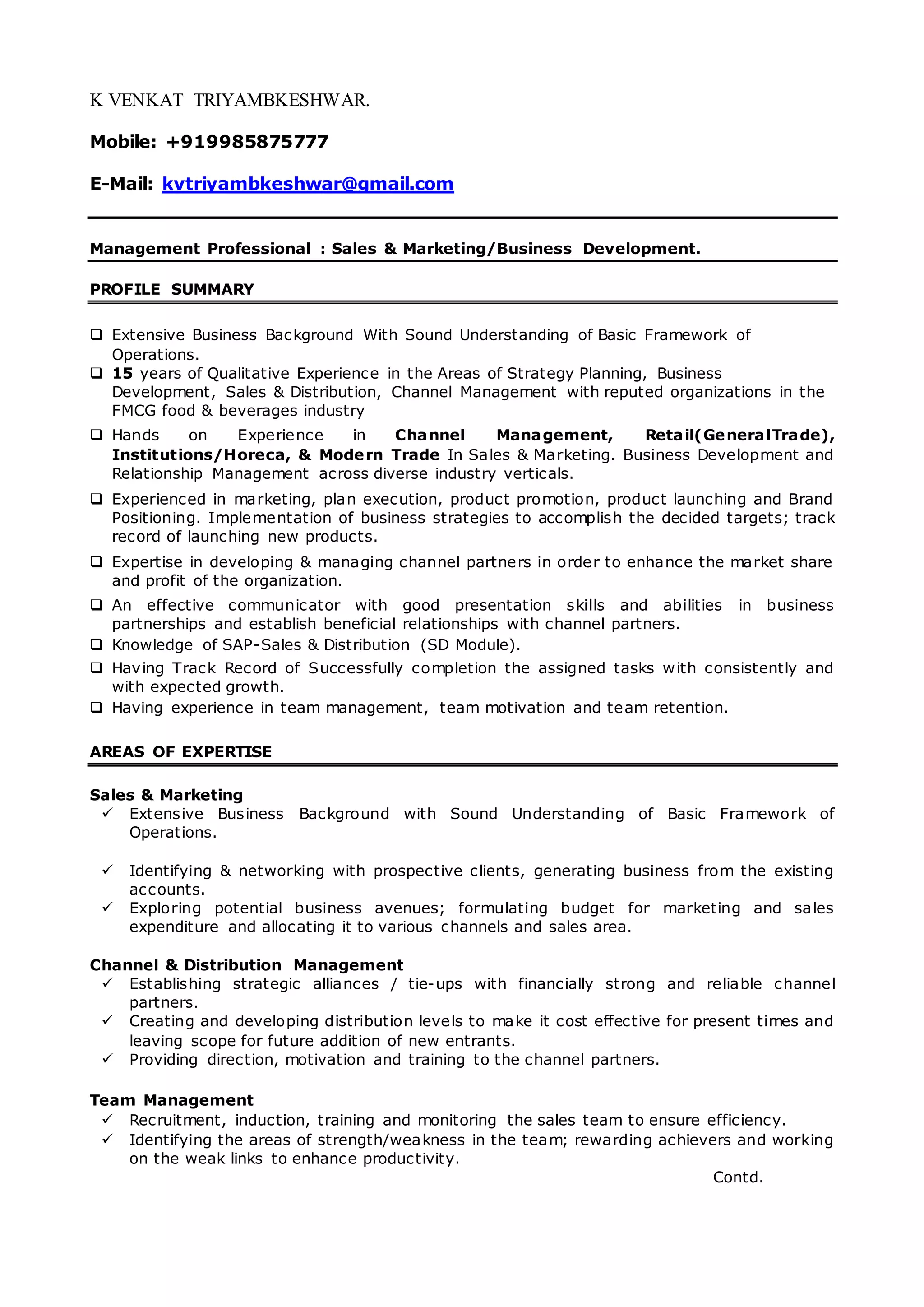 This document contains a summary of K Venkat Triyambkeshwar's professional experience and qualifications. He has over 15 years of experience in sales, marketing, business development and channel management in the FMCG industry. Currently working as a Corporate Manager of Sales for Sanzyme (P)LTD, he has previously held roles like Business Development Manager and Executive Sales at other companies like Parle Agro Pvt. Ltd., Danone Foods and Beverages India Pvt. Ltd., and Hindustan Coca Cola Beverages Private Limited. He has an MBA in Marketing and degrees in Economics and Political Science.